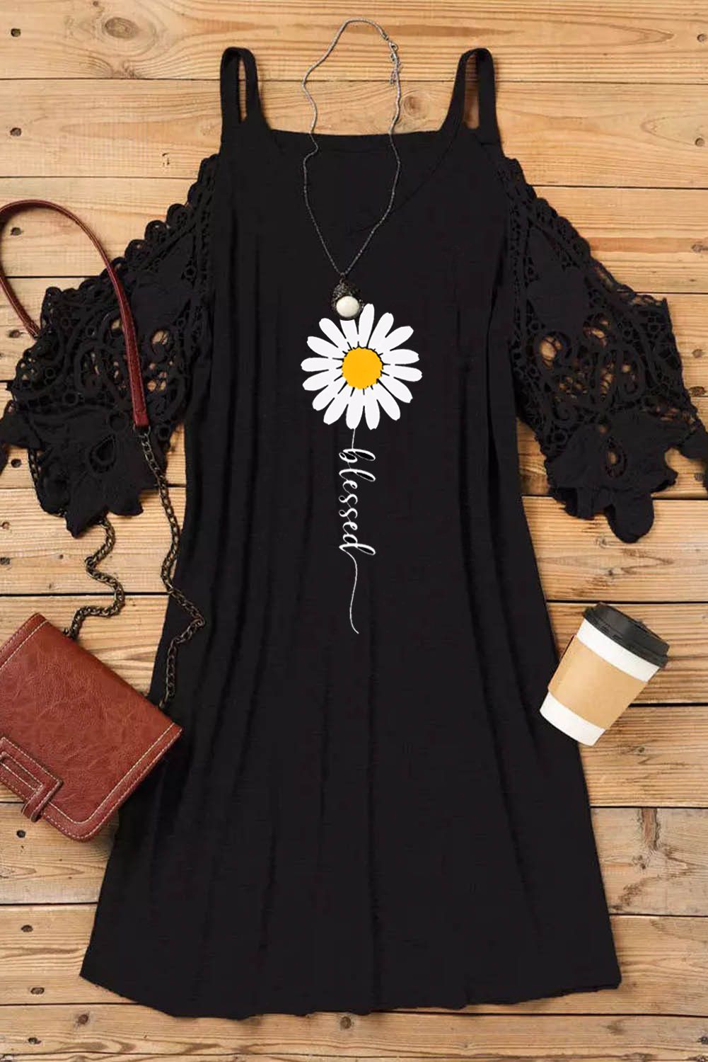 Black Blessed Daisy Print Lace Sleeve Ruched Mini Dress