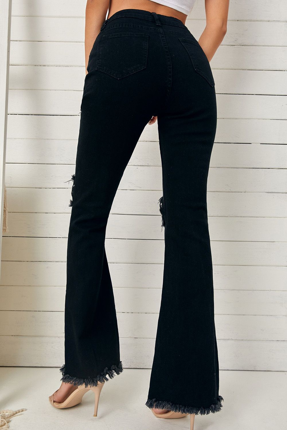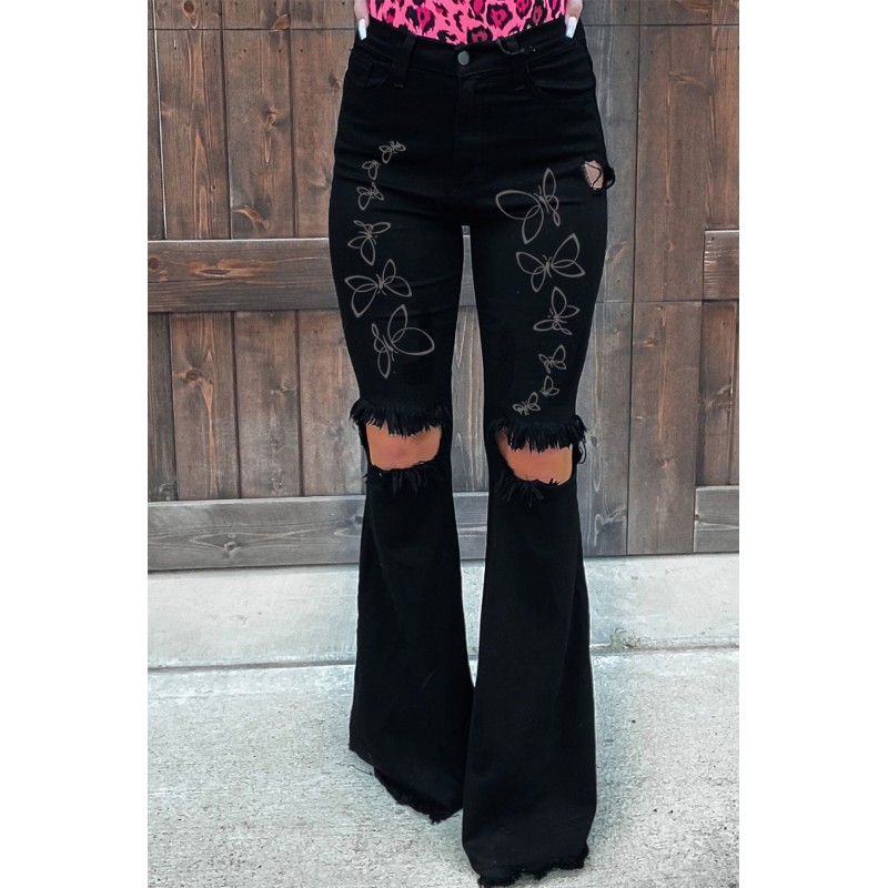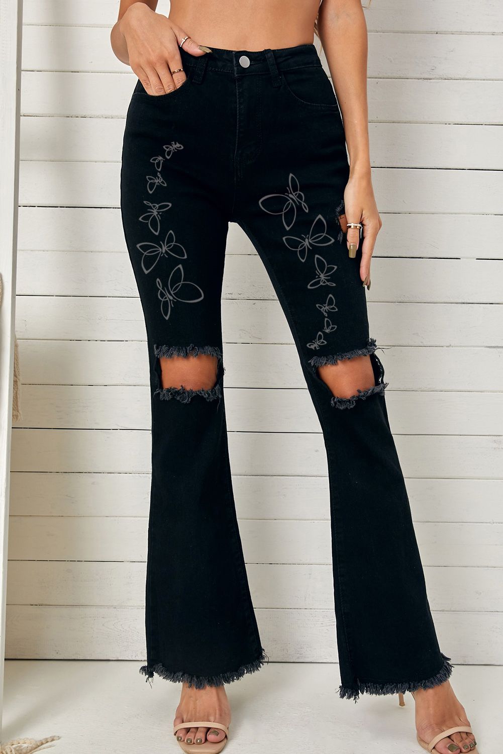 Black Butterfly Print Raw Hem Ripped High Waist Flare Jeans