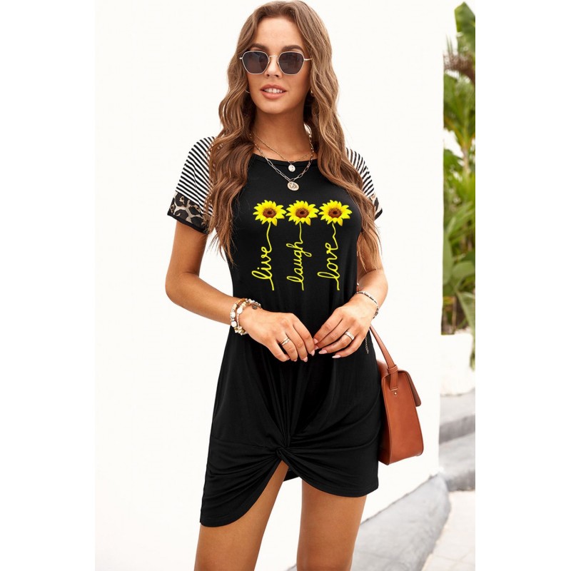 Black Letter Sunflower Print Twist Knot Short Sleeve Mini Dress