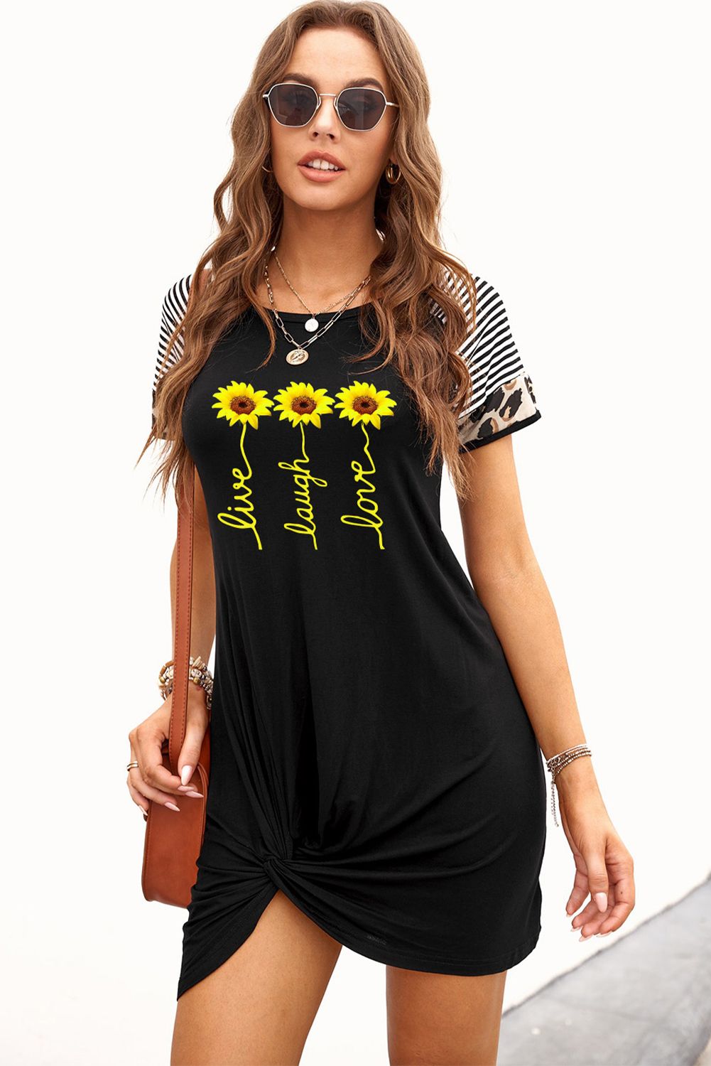 Features striped leopard mixed prints at sleeves and chic sunflowers on the frontCasual mini dress with crew neck, short sleeves, twisted hem and loose fit designMade from premium and super soft, this shift dress is cozy, stretchy and breathable on your skin, you’ll stay comfy all day longShort dress with a loose and straight design can well modify your figureGraphic dresses wholesale are perfect to pair with your high heels or sneakers as a good choice