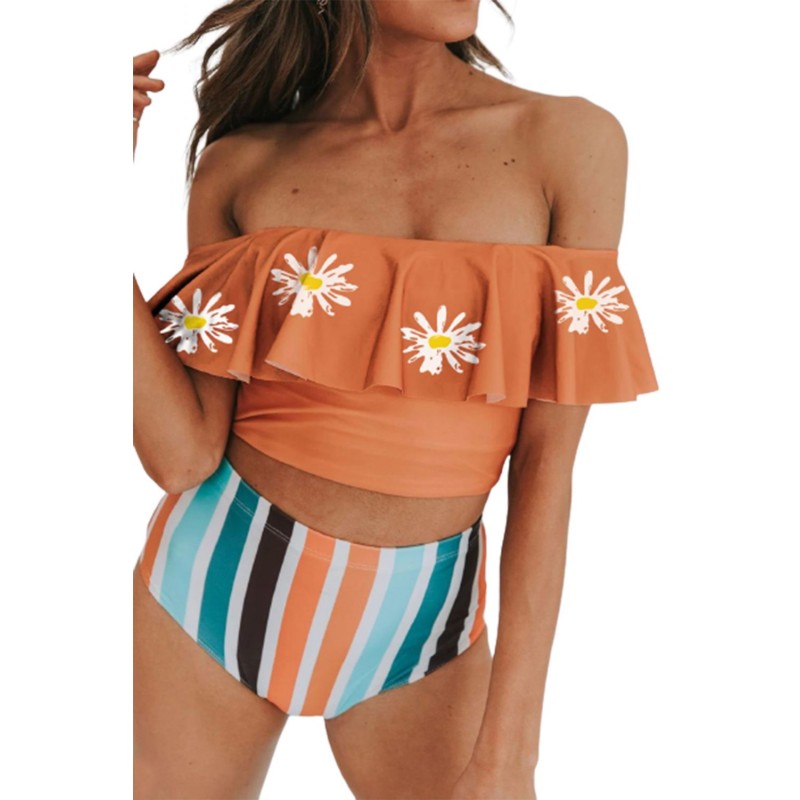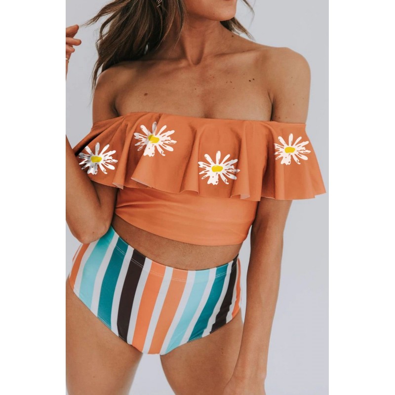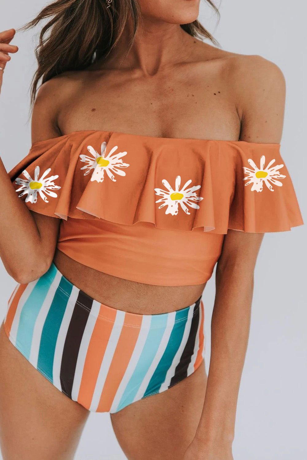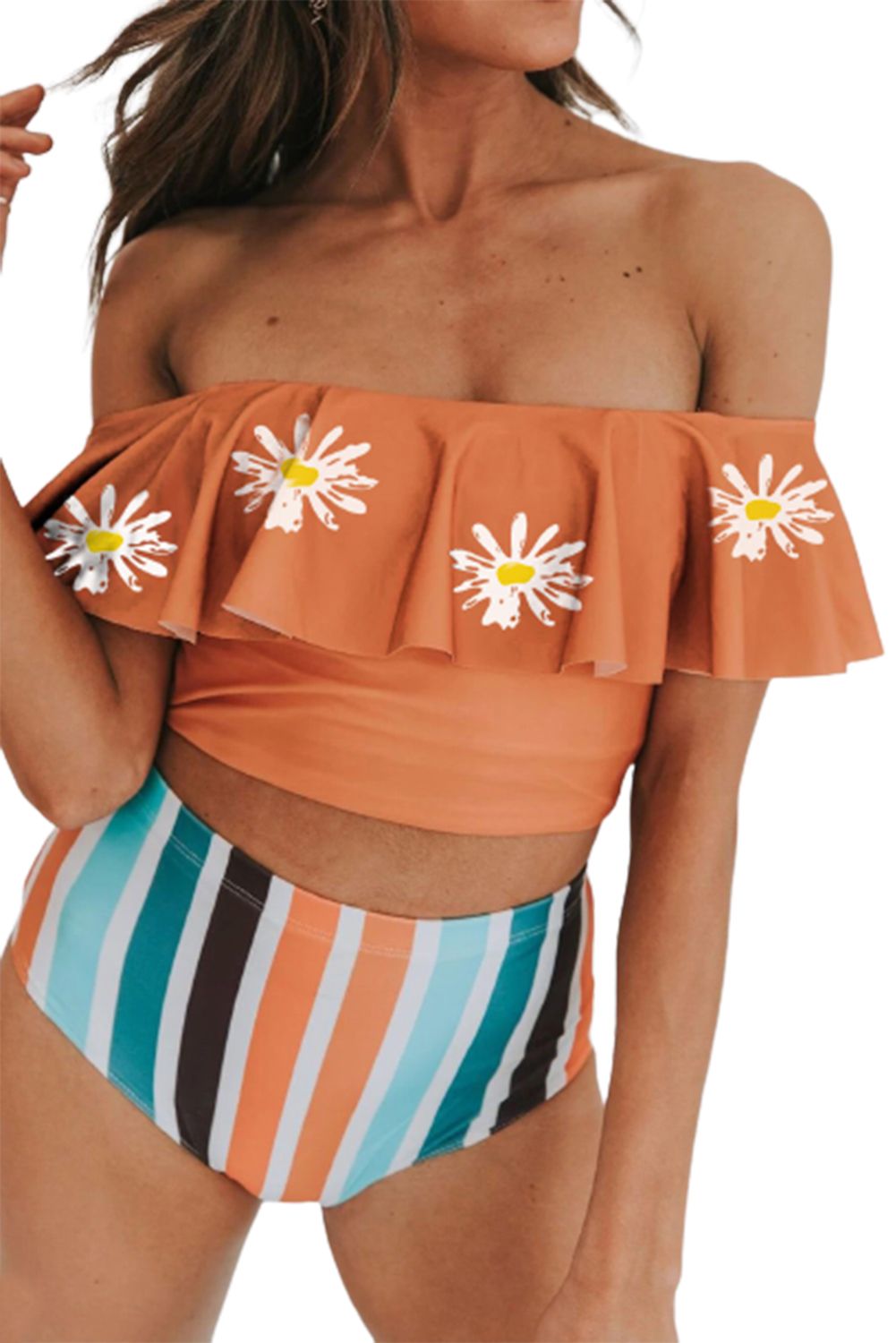 Orange Ruffles Overlay Off Shoulder Top and Striped Panty Bikini