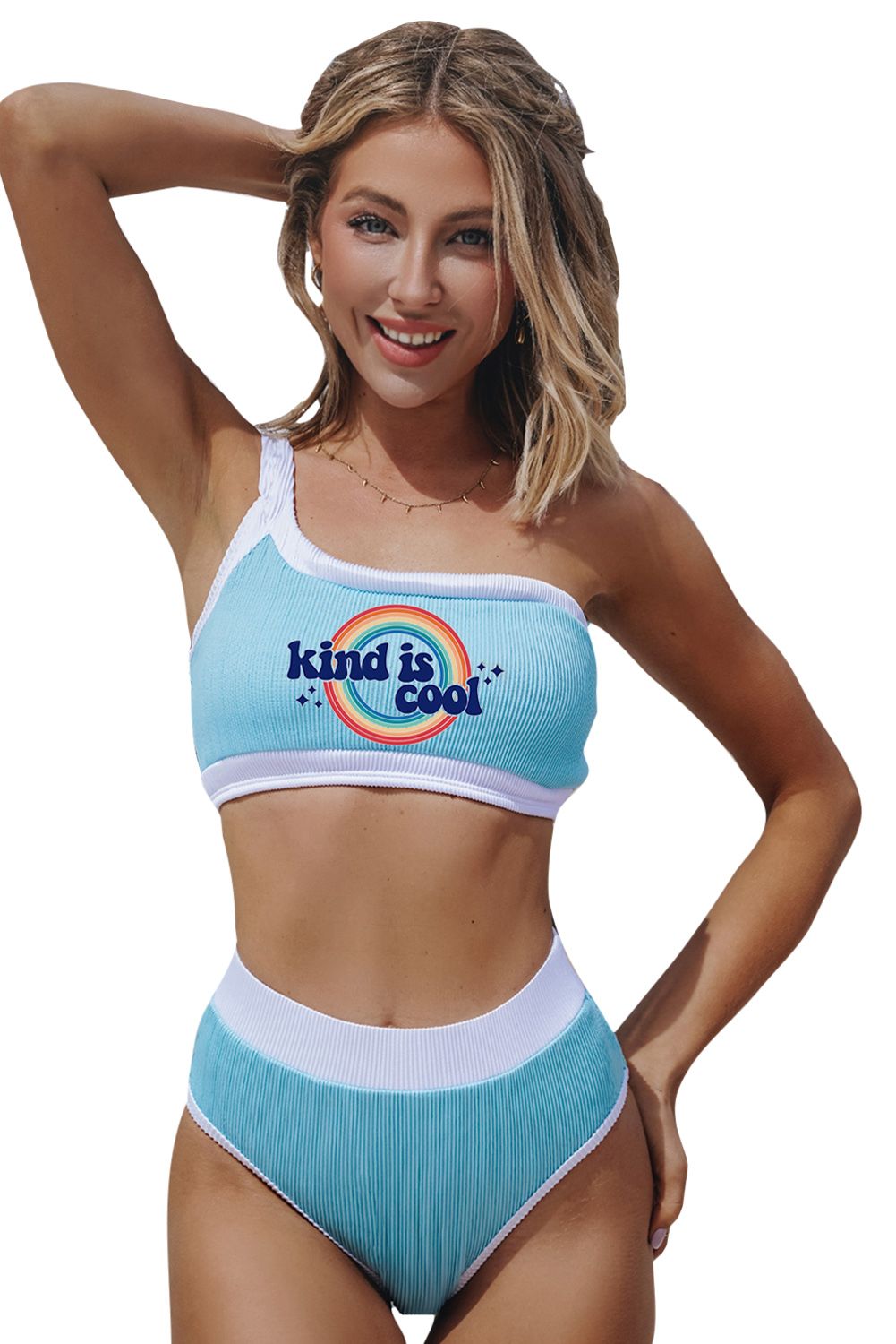 Letter Graphic Print Ribbed One Shoulder High Waist Bikini Swimsuit