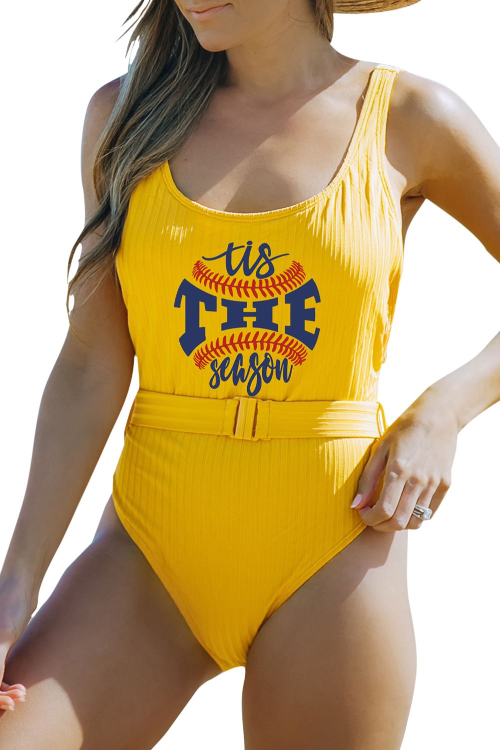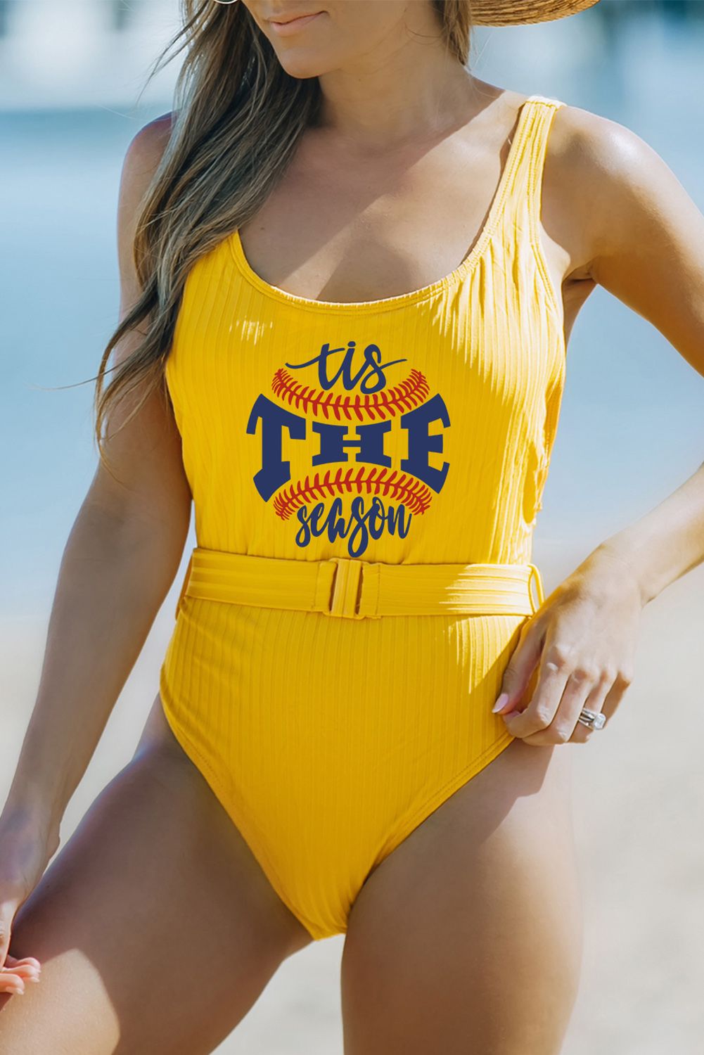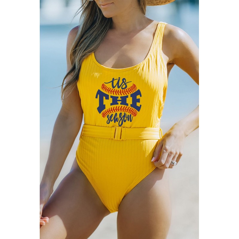 Baseball Letter Print Ribbed Backless One-piece Swimwear