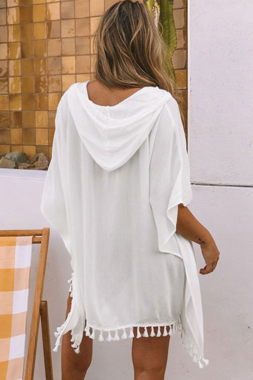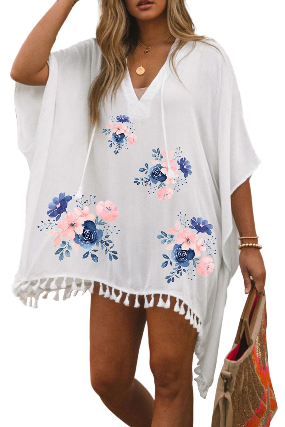 Floral Print Fringe Trim Hooded Oversized Beach Cover Up