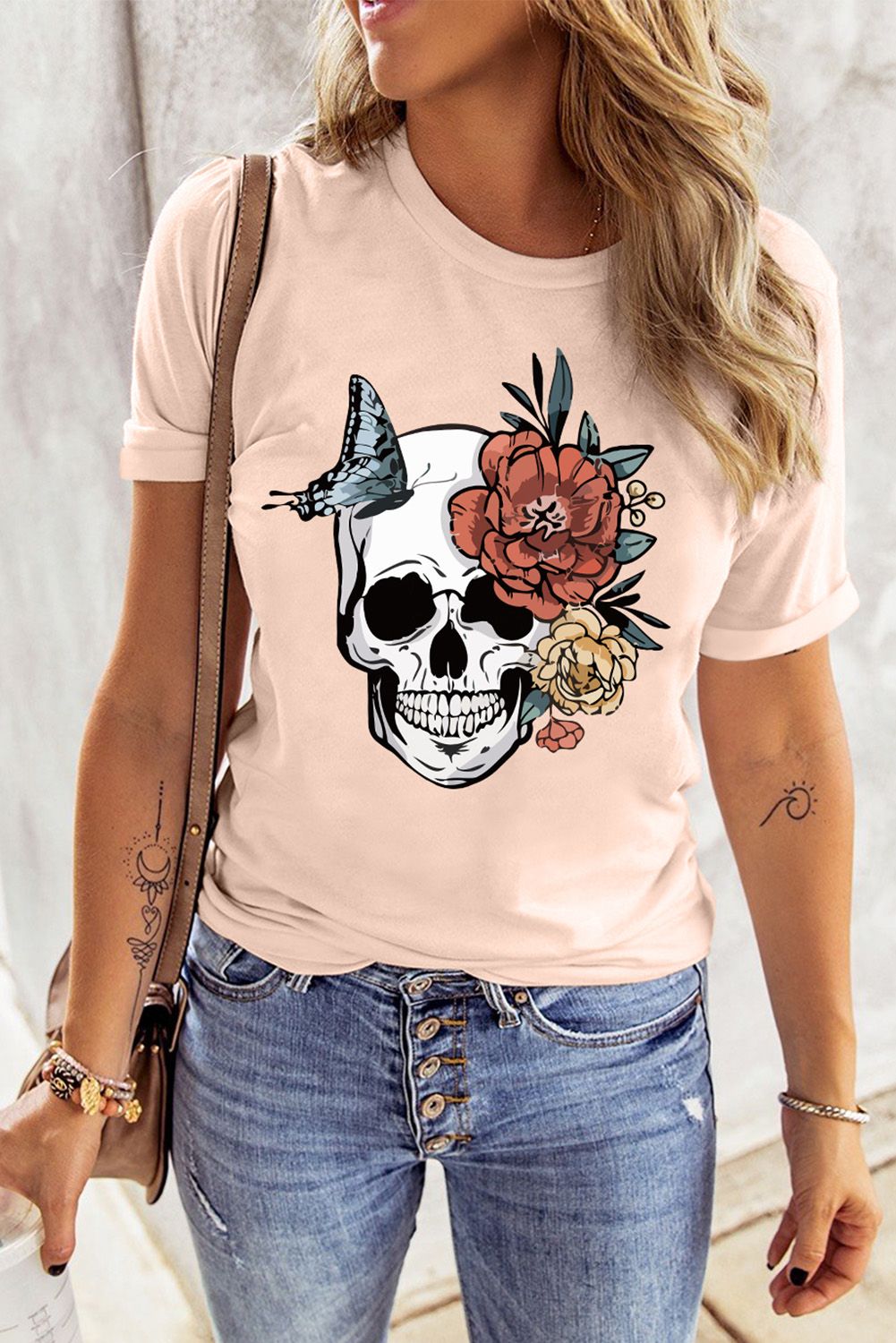 Pink Skull Floral Butterfly Printed Short Sleeve T Shirt
